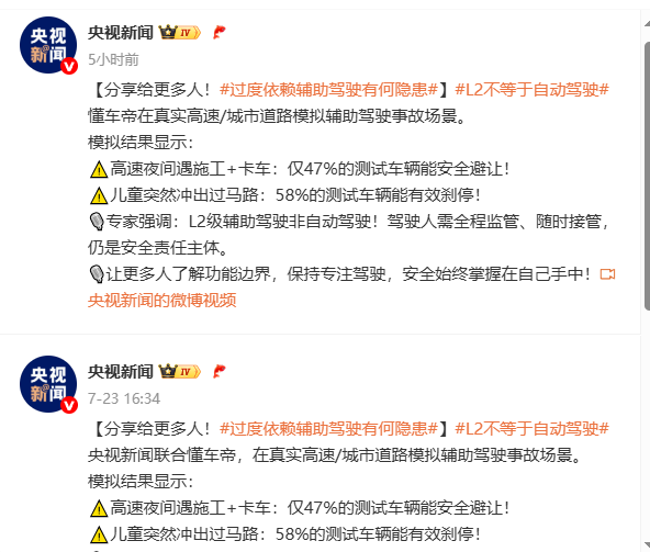 近日,懂车帝发布了对多款车型,在城市和高速路段的事故场景模拟下的辅助驾驶的表现引起了很大的争议。随后,有网友发现央视新闻已经在之前的发的微博上进行了修改,将联合懂车帝中的“联合”二字给悄然去掉。