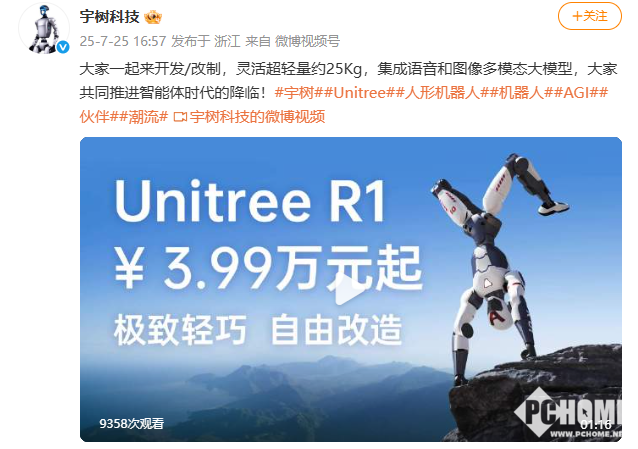 2025年7月25日消息,杭州宇树科技官方发布人形机器人Unitree R1,售价3.99万元起,全身关节数量26个,重量约25Kg,集成语音和图像多模态大模型,外观支持改制。