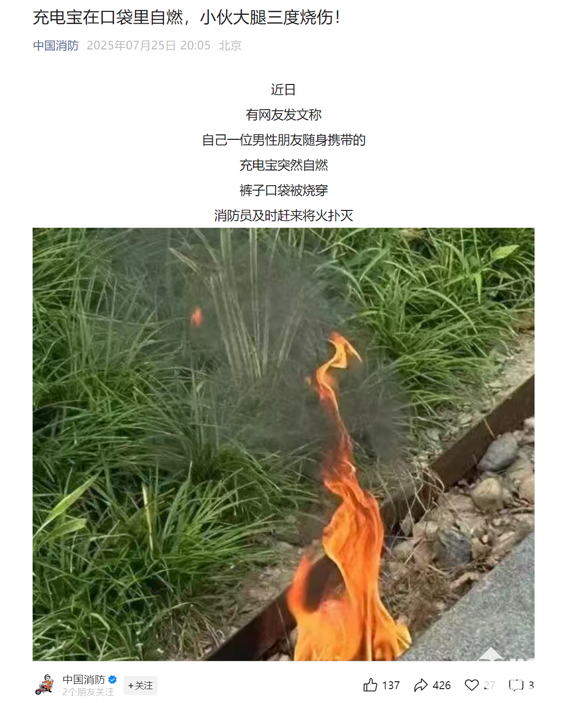 7月26日,据中国消防公众号昨日介绍,近日有网友发文称自己一位男性朋友随身携带的充电宝突然自燃,裤子口袋被烧穿,消防员及时赶来将火扑灭。