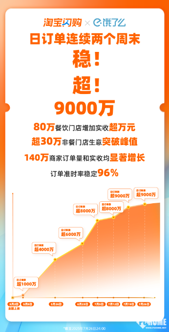 7月28日,淘宝闪购和饿了么今日联合宣布,连续两个周末日订单超9000万(不含0元购及自提)。