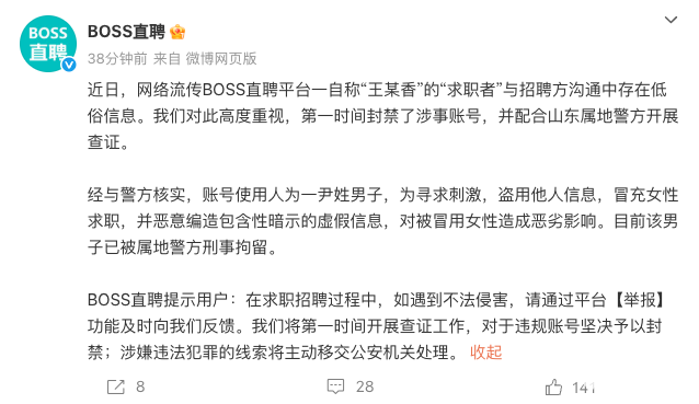 近日,一则“BOSS直聘平台上一求职者简历及对话涉黄”的消息引发广泛关注。对此,BOSS直聘官方微博回应称,经核实,该账号系一名男性用户冒充女性伪造,平台已对涉事账号永久封禁。