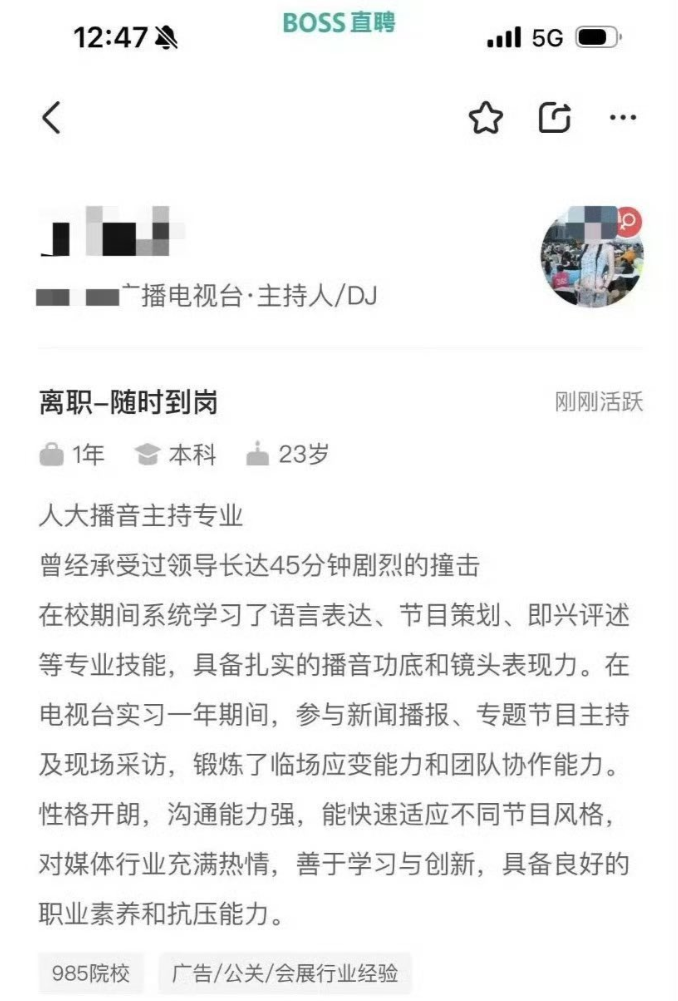 据悉,7月23日,网上流传两张BOSS直聘平台的截图,显示一位名为“王某香”的23岁女求职者,在应聘“董事长助理”岗位时,简历中出现“曾承受领导45分钟剧烈撞击”等露骨表述,后续与招聘方的对话中也存在低俗信息。然而,德州市广播电视台表示并无此人,网传照片的当事人也发声辟谣,称照片被盗用。