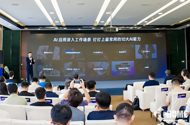 在活动中,朱鸿还发布了钉钉上最常用的十大AI场景能力,有一些AI能力让人机协作变得简单,如语音转文字和IM消息的速读、摘要、总结能力等。还有一些AI能力通过技术平权,降低对使用者能力的要求,如消息翻译、AI表格、智能财务数据洞察等。还有一些AI能力帮助使用者减少重复性工作,提高效率,如员工关怀、合同审查摘要、会议记录、文档内容纠错以及视频会议AI实时字幕等。