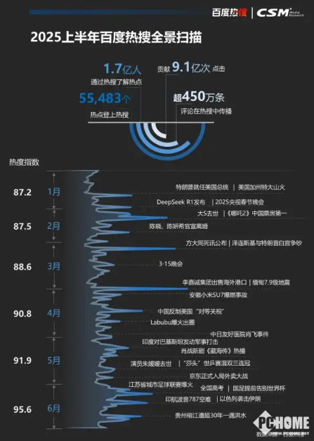7月28日,百度热搜联合中国广视索福瑞媒介研究(CSM)正式发布《2025上半年百度热搜报告》。据介绍,这份基于5.5万个热点议题和逾1.7亿用户行为数据的报告,清晰呈现了国民关注焦点的变迁轨迹。百度热搜上半年累计收获超9.1亿次点击量,成为公众注意力的核心枢纽。用户在热搜中解读时局、追踪名人、获取权威资讯,同时探索多元兴趣、感知文化潮流。