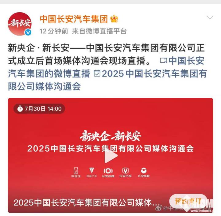中国长安汽车集团官方微博发布媒体直播预约窗口,将在明日(7月30日)14:00开展首场媒体沟通会,观众可通过微博预约观看现场直播。届时以朱华荣为核心的管理团队将集体亮相,旗下长安、深蓝、阿维塔等子品牌负责人将详解2025年上半年市场表现及下半年战略规划。