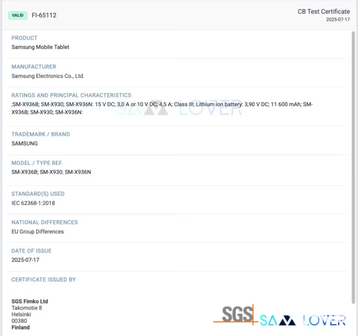 三星Galaxy Tab S11 Ultra通过SGS认证,该设备电池典型容量为11600mAh,较前代提升3.6%。
