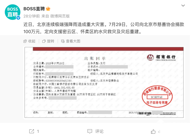 2025年7月29日,BOSS直聘在社交媒体平台宣布,公司向北京市慈善协会捐款100万元,定向支援密云区、怀柔区的水灾救灾及灾后重建。