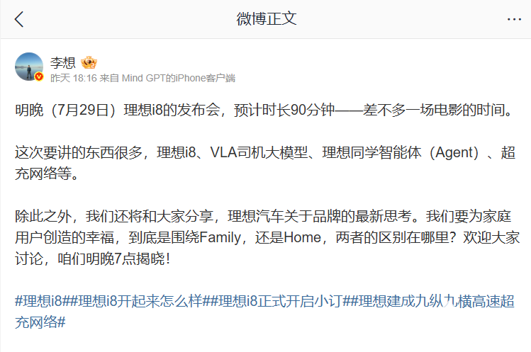 昨日,李想还发布微博预热了今日晚间7:00理想i8发布会,还强调会在发布会中透露理想i8、VLA司机大模型、理想同学智能体(Agent)、超充网络等相关信息。