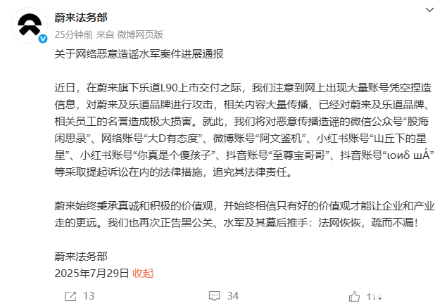 7月29日,蔚来法务部今日发布了关于网络恶意造谣水军案件进展通报,表示将起诉在网络对乐道、蔚来进行恶意抹黑的账号。