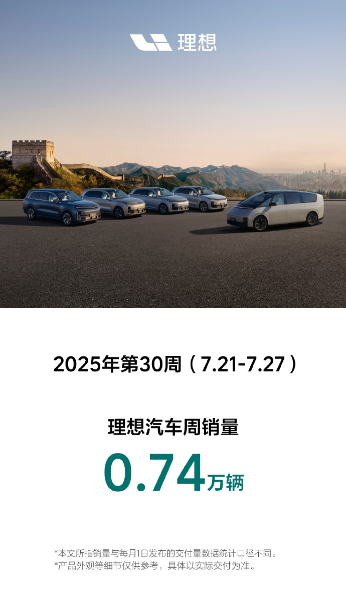 2025年7月29日,理想汽车官方微博发布消息,2025年第30周(7月21日至7月27日),理想汽车周销量达到0.74万辆。
