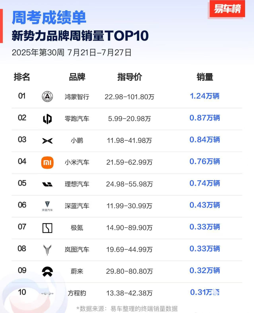 值得注意的是,易车还发布了最新一周的新势力品牌周销榜数据。此次周榜中,鸿蒙智行以周销量1.24万量登顶榜首,零跑汽车、小鹏、小米汽车,分别以周销量0.87万辆、0.84万辆和0.76万辆紧随其后,理想汽车以0.74万辆占据榜五。从易车榜新势力品牌周销量TOP10来看,各大车企展现出百花齐放的场面。前TOP5可以算是断层领先,TOP6-TOP10销量相差较小,竞争激列。