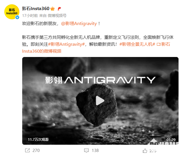 7月29日,影石Insta360昨晚正式官宣旗下全景无人机品牌影翎Antigravity。该品牌由影石与第三方合作孵化,计划推出全球首款“全景无人机”,为用户带来前所未有的飞行拍摄体验。