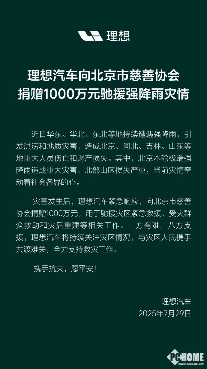 7月29日,理想汽车宣布向北京市慈善协会捐赠1000万元,专项用于灾区的紧急救援、受灾群众安置及灾后基础设施重建。理想汽车表示,将持续关注灾情进展,与受灾地区共渡难关。