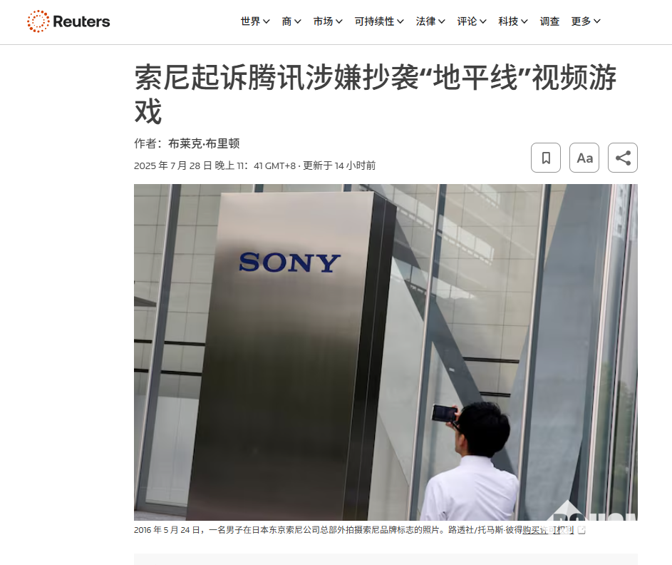 7月29日,据路透社报道,索尼公司已对腾讯发起版权和商标侵权诉讼,指控腾讯旗下新游戏《荒野起源》对索尼《地平线》游戏系列进行了“盲从式克隆”。索尼表示此举“造成无法弥补的伤害”并索赔15万美元。