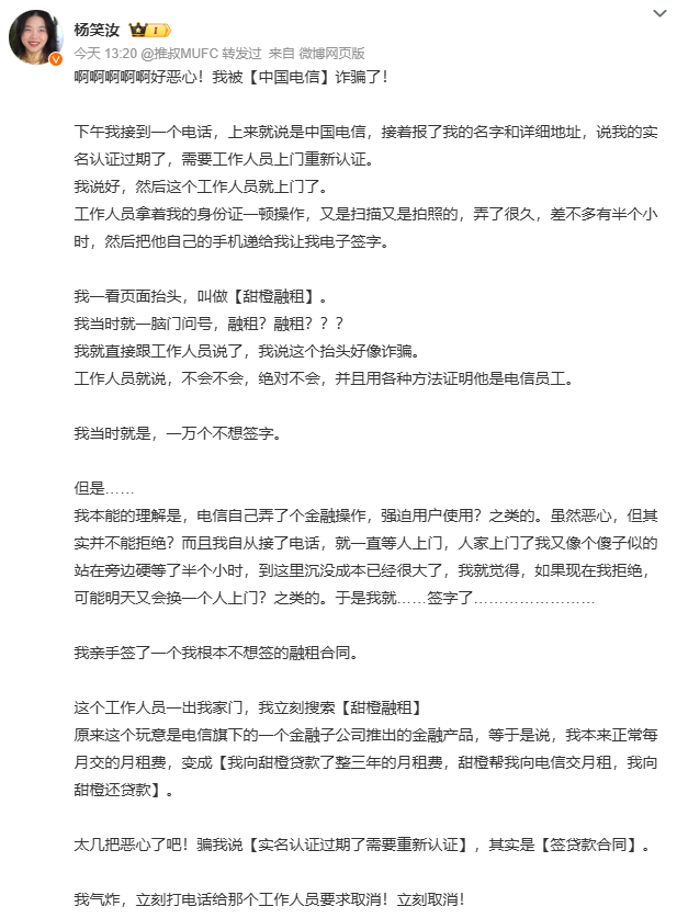 7月29日,据新浪财经今日报道,有微博网友爆料称被中国电信“诈骗”,网友称接到自称“中国电信”的电话,并报了其名字和详细地址,称其实名认证过期了,需要工作人员上门重新认证。工作人员上门操作之后,让网友签署抬头为“甜橙融租”的合同。