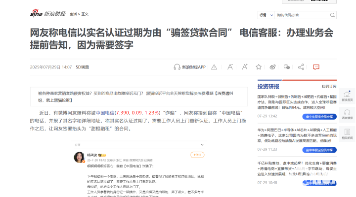 7月29日,据新浪财经今日报道,有微博网友爆料称被中国电信“诈骗”,网友称接到自称“中国电信”的电话,称其实名认证过期了,需要工作人员上门重新认证。随后,让网友签署抬头为“甜橙融租”的合同。