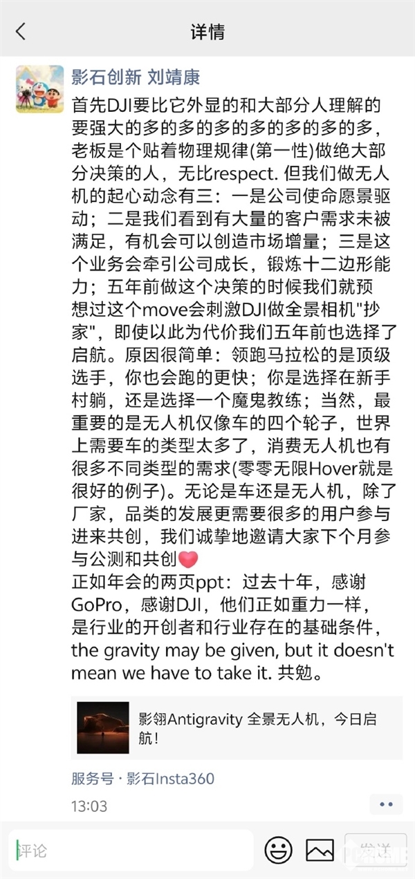7月29日,今日,影石创始人刘靖康发布朋友圈,称做无人机的起心动念有三个,并称无比尊重大疆。