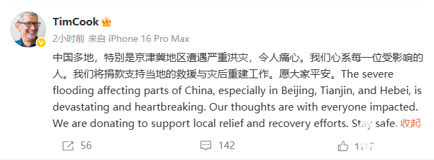近日,华北多地遭遇强降雨引发洪涝与地质灾害,北京北部山区等受灾严重,多家科技企业纷纷伸出援手,向北京市捐赠善款支援救灾。今日苹果CEO库克在社交媒体平台上表示,苹果将捐款支持当地的救援与灾后重建工作。