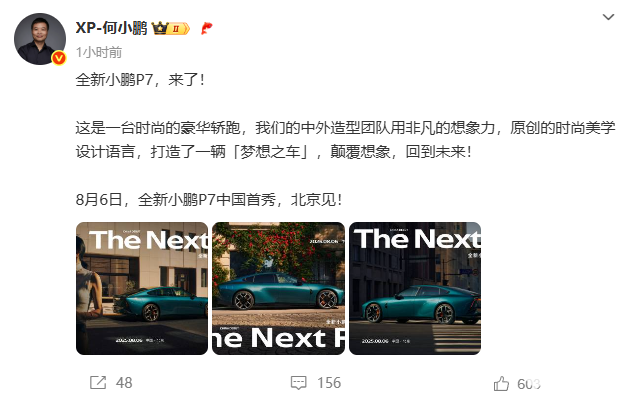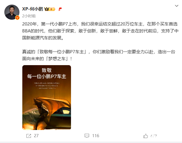 何小鹏还发文表示,第一代小鹏P7于2020年上市,很幸运结交超过20万位车主。