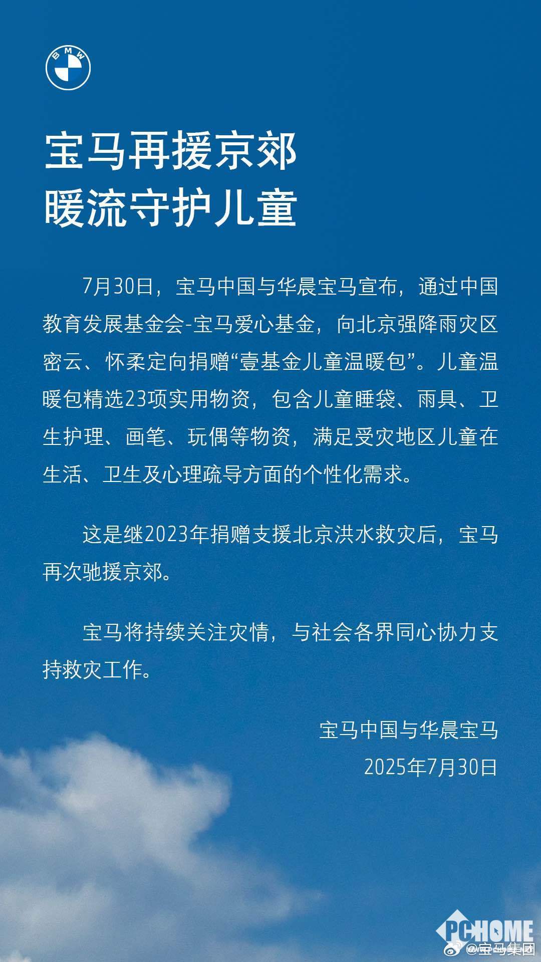 7月30日,宝马集团与华晨宝马联合发布公告,宣布通过中国教育发展基金会旗下“宝马爱心基金”,向北京市受强降雨影响严重的密云区和怀柔区定向捐赠“壹基金儿童温暖包”,用于支持当地儿童群体的紧急生活和心理支持需求。