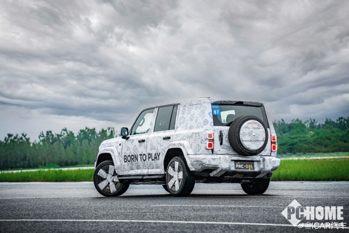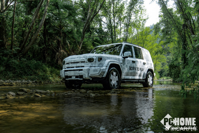 iCAR V27定位硬派越野风格,采用方正“盒子”造型,车长近5米,配备外挂式备胎、高离地间隙及AT轮胎,圆形日行灯与宽幅格栅前脸搭配垂直线条,凸显力量感,内饰预计延续科技与越野融合风格。
