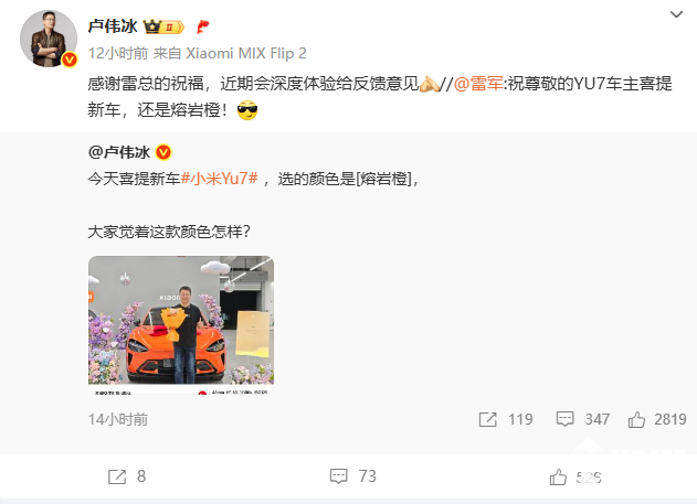 7月31日,小米集团合伙人、总裁,手机部总裁,小米品牌总经理卢伟冰昨日晚间发文表示,喜提新车小米YU7,选的是熔岩橙配色。值得一提的是,小米YU7早在7月6日就开启了交付,而卢伟冰到昨日才提车。