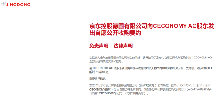 2025年7月31日消息,据路透社报道,京东控股德国有限公司宣布向德国零售巨头CECONOMY AG股东发出公开收购要约,以每股4.60欧元的现金对价收购CECONOMY所有股票,CECONOMY估值约为22.3亿欧元,约合26.3亿美元。CECONOMY CEO卡伊-乌尔里希·戴斯纳Kai-Ulrich Deissner博士表示,他预计此次收购交易将在2026年山半年完成。