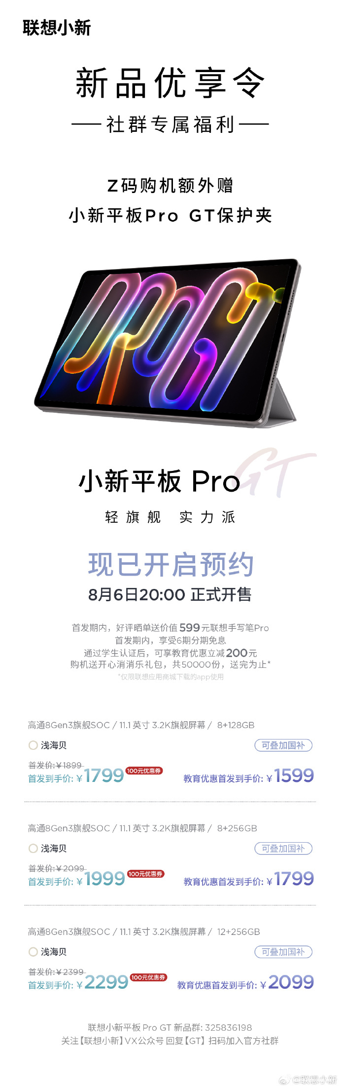 7月31日,联想今日正式公布小新平板Pro GT的核心参数,这款定位“轻旗舰实力派”的新品将于8月6日20:00正式开售,首发到手价1799元起,教育优惠用户可享1599元起的超值价格。
