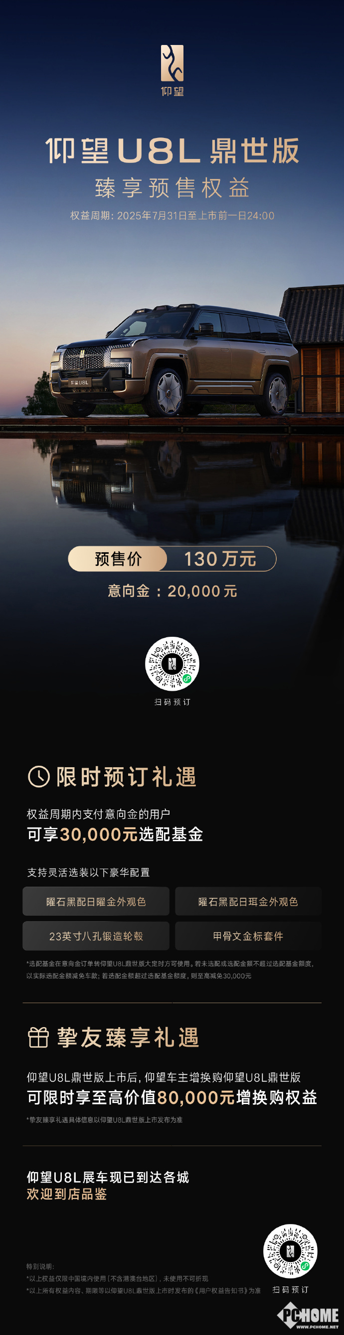 目前,限时支付意向金可享30,000元选配基金,仰望车主增换购可限时享至高价值80,000元增换购权益。
