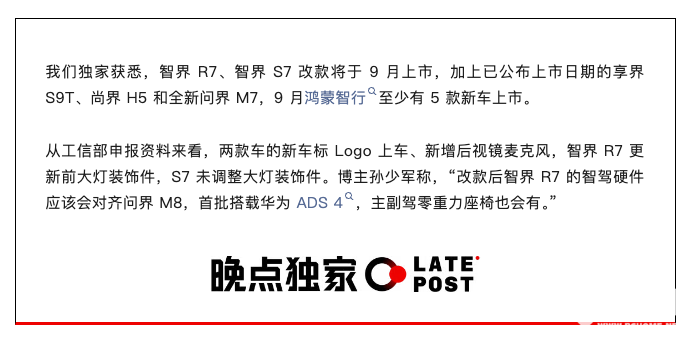 2025年7月31日,《晚点Auto》爆料称,智界R7、智界S7改款将于2025年9月上市。加上已官宣的享界S9T、尚界H5和全新问界M7,9月份,鸿蒙智行至少有5款新车上市。