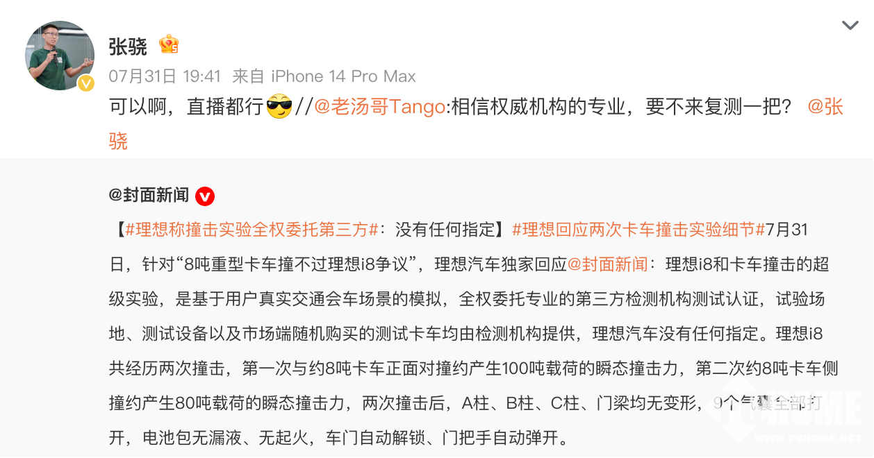 理想汽车第一产品线总裁汤靖转发理想官方的回复表示,“相信权威机构的专业,要不来复测一把?”理想汽车第二产品线总裁则表示,“直播都行”。