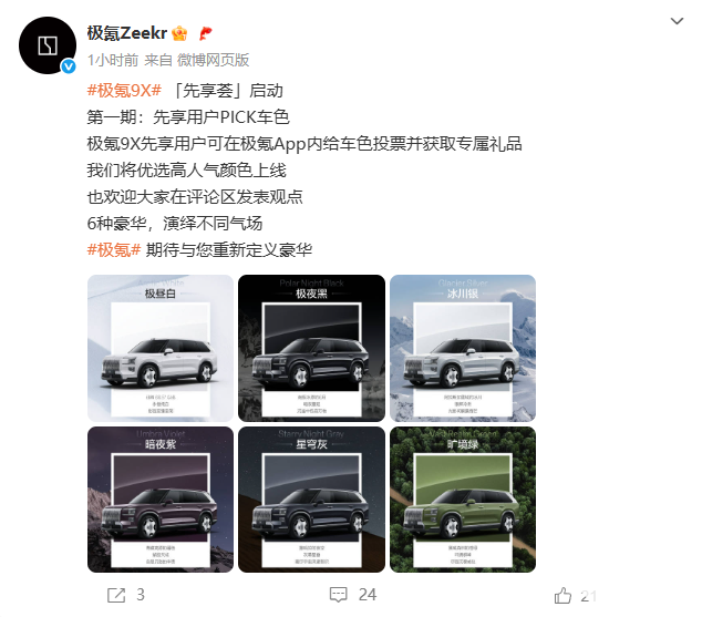 8月1日,极氪官方今日公布了极氪9X六款车身颜色(极昼白、极夜黑、冰川银、暗夜紫、星穹灰、旷境绿),并表示会根据先享用户的意向优先选择人气高的颜色上线。目前,极氪9X已经确定将在8月底成都车展正式开启预售。