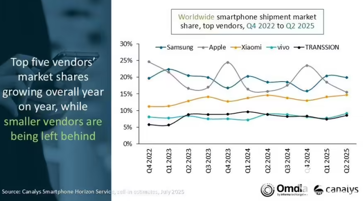 近日,市场调研机构Canalys发布报告显示,2025年第二季度全球智能手机出货量为2.889亿台,与去年同期基本持平。这一数据反映出全球手机市场在当前阶段的相对稳定性,尽管面临诸多挑战,但整体态势较为平稳。