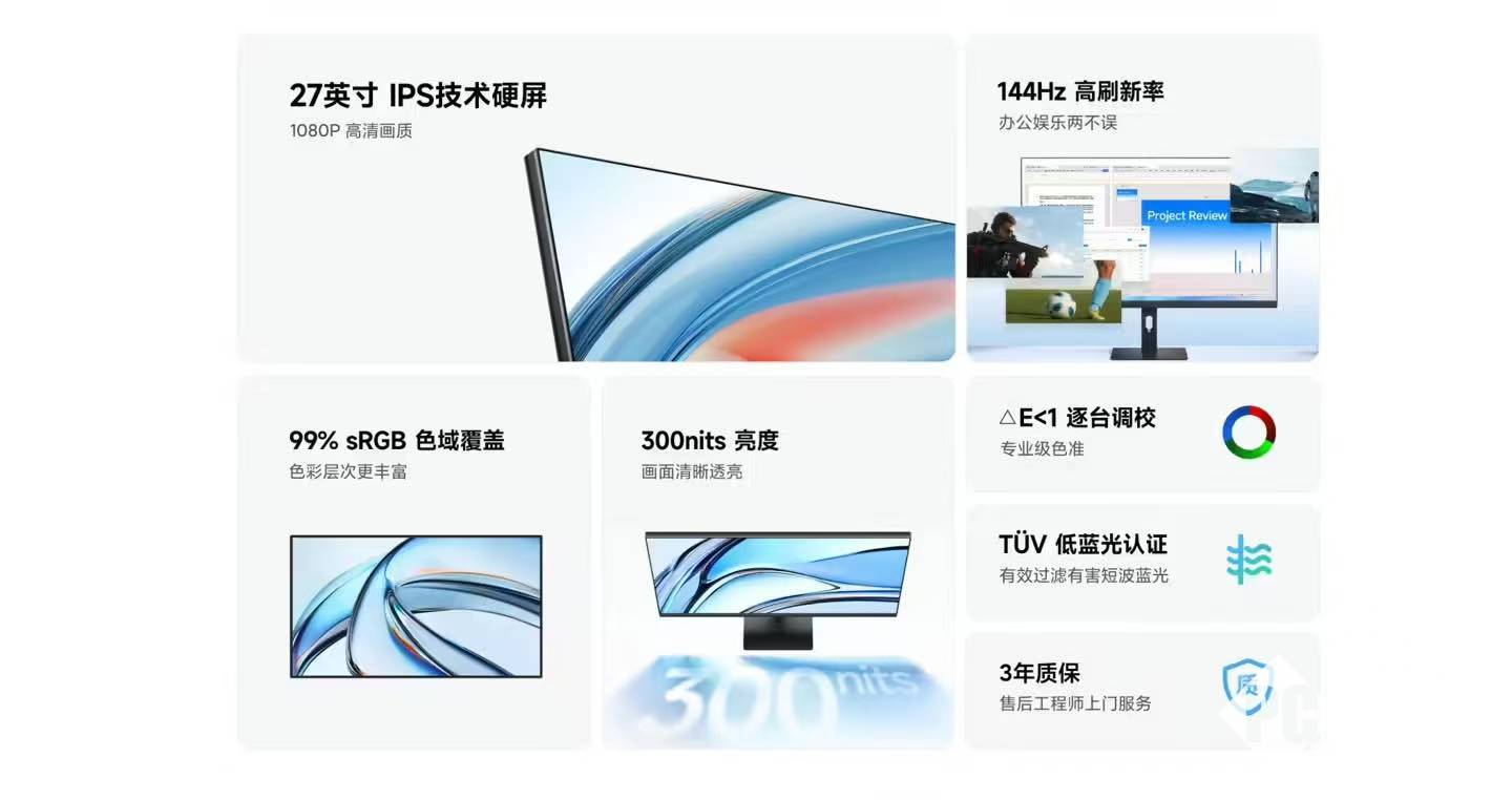 该产品配备一块27英寸IPS面板,分辨率为1920×1080,刷新率达到144Hz。厂商表示,该刷新率配置有助于提升滚屏阅读、文档浏览以及日常游戏的流畅度,适应多任务办公及轻度娱乐用户需求。显示器支持178°广视角,覆盖99% sRGB色域,具备1670万色显示能力,并在出厂阶段逐台进行色彩调校,官方宣称色差ΔE<1,满足一般设计与内容制作基础要求。