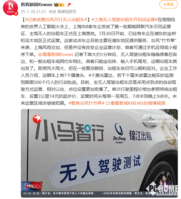 据上海广播电视台,7月30日开始,已经有无人驾驶出租车在浦东新区的金桥和花木地区正式运营。乘客可以通过小程序下单,出租车停靠在约定地点以后,在后排落座,输入手机尾号,无人驾驶出租车即刻出发驶向目的地。