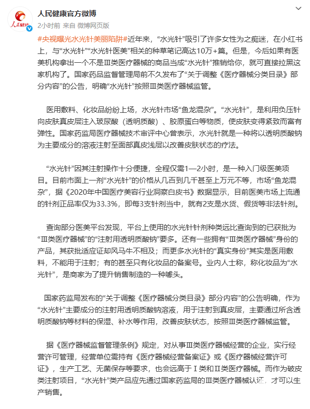 8月4日,央视财经曝光了在小红书上违规代打水光针的乱象。根据人民健康官方报道,在小红书上与“水光针”“水光针医美”相关的种草笔记高达10万+篇。