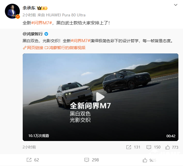 8月4日消息,鸿蒙智行今日发布全新问界M7黑白双车动态视频,纯黑、纯白两款经典配色正式亮相,新车还可选配黑曜套件,并表示该车将于9月正式发布。华为常务董事、终端BG董事长余承东表示:“全新问界M7,黑白武士款给大家安排上了。”