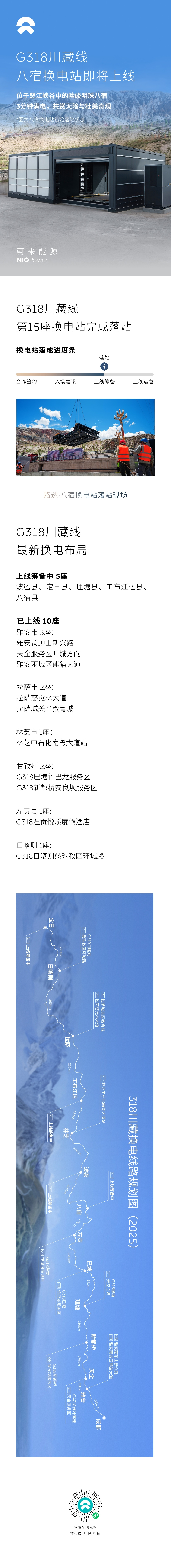 根据规划,蔚来将沿G318川藏线布局15座换电站,形成覆盖川西至藏东的补能通道。