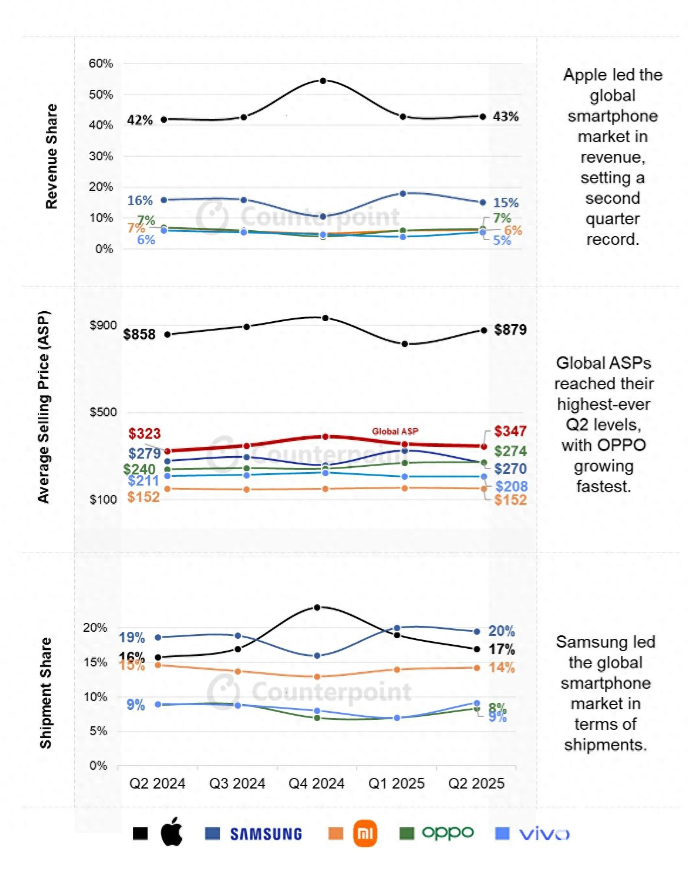 另外,OPPO的ASP在2025年第二季度同比增长14%,为前五大品牌中增幅最高,而其营收则同比增长10%。市场营收占比具体排名上苹果、三星占据前二,OPPO、小米、vivo差距不大,分列第三、四、五位。