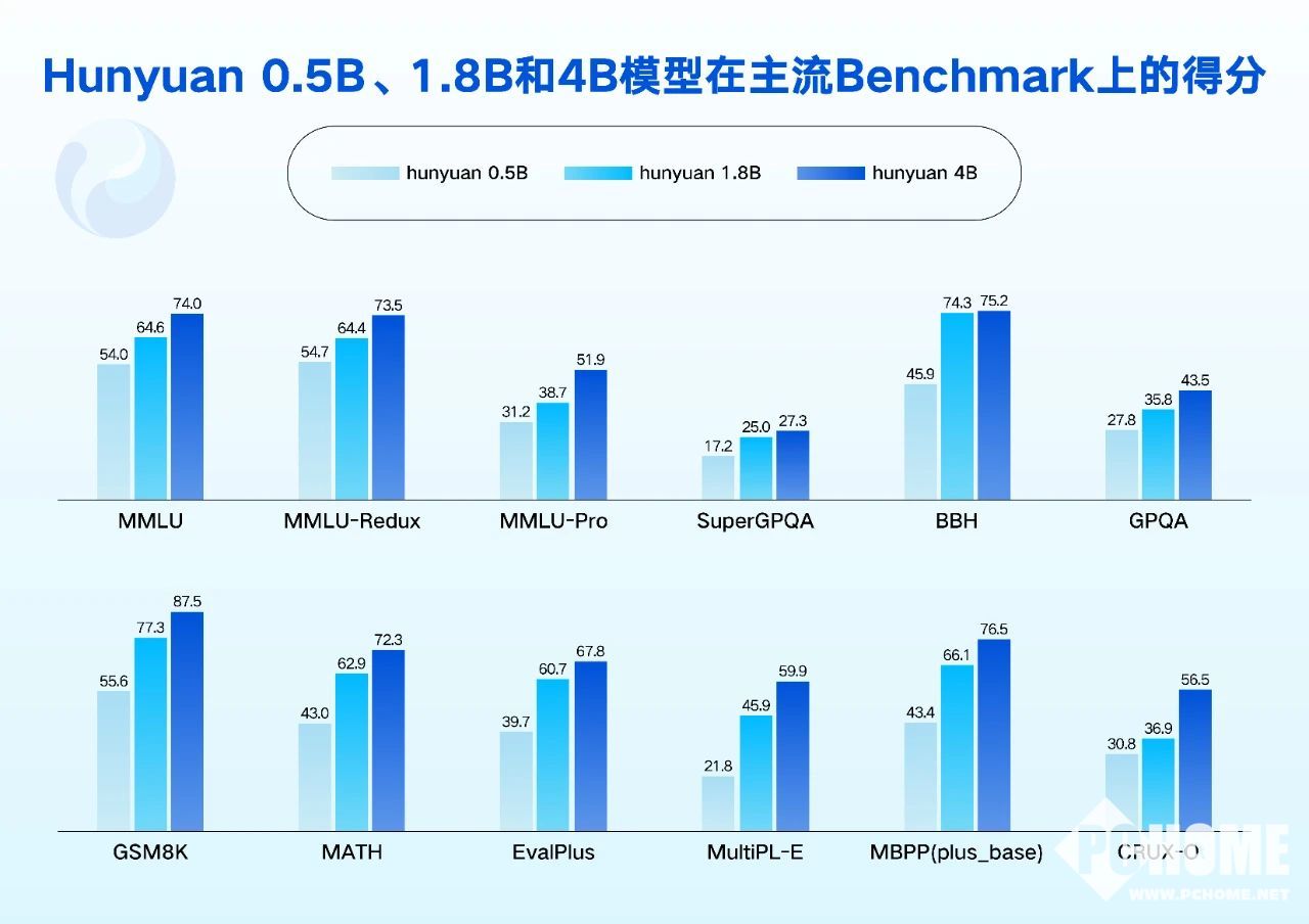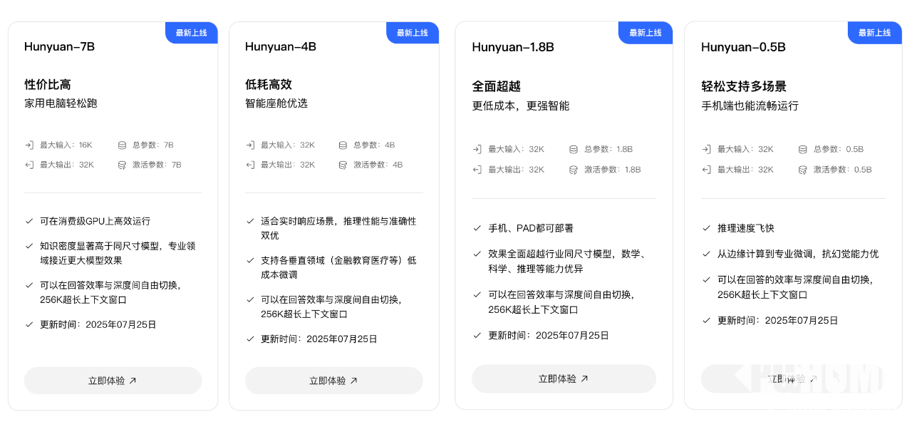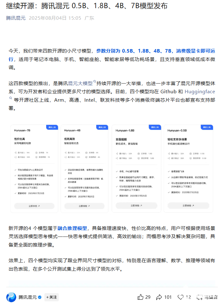 8月4日,腾讯混元今日发布了四款开源的小尺寸模型,参数分别为0.5B、1.8B、4B、7B,消费级显卡即可运行,适用于笔记本电脑、手机、智能座舱、智能家居等低功耗场景,且支持垂直领域低成本微调。