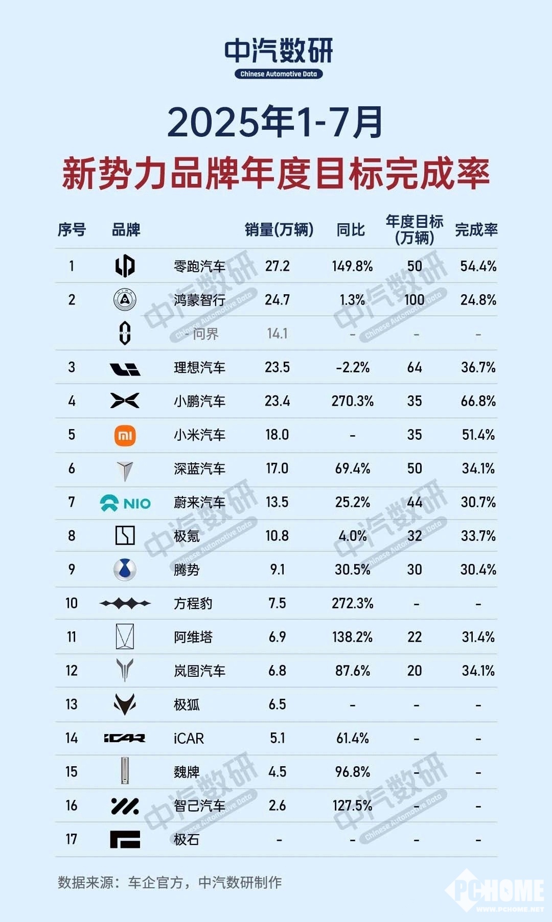 近日,中汽数研披露了2025年1-7月新势力品牌年度目标完成率数据,多家车企表现引发关注。