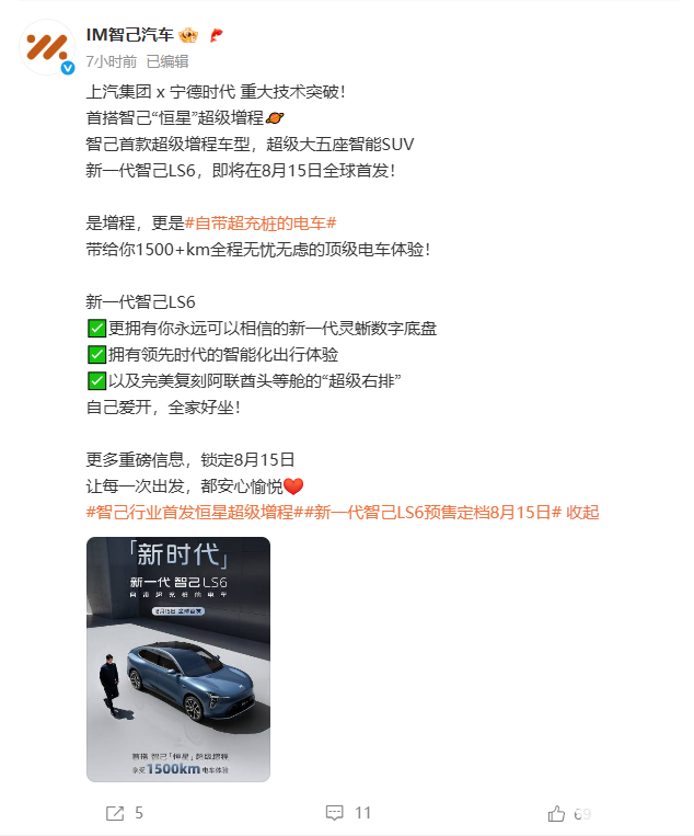 8月4日,智己汽车官方宣布,新一代智己LS6将于8月15日全球首发。作为智己首款超级增程车型,其定位为“超级大五座智能 SUV”,首搭智己“恒星”超级增程。