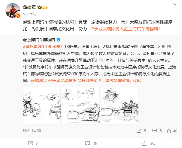 8月4日,上海汽车博物馆昨日发文称。上海汽车博物馆诚邀长城灵魂S2000摩托车入藏,成为中国工业设计和骑行文化的鲜活注脚。对此长城汽车董事长魏建军发文表示感谢,并会继续努力,为发展中国摩托文化出一份力。