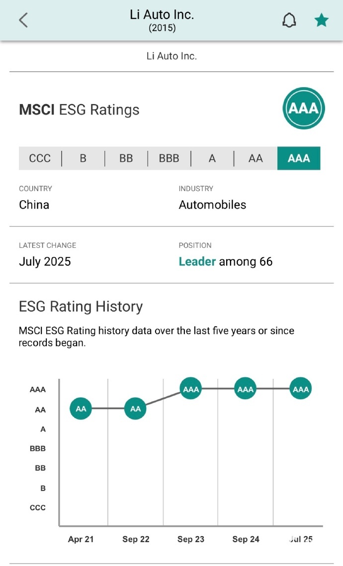 8月4日,理想汽车官方微博宣布,在7月31日国际指数公司MSCI公布的最新一批全球企业2025年ESG评级中,理想汽车连续三年荣获 “AAA” 全球最高评级。
