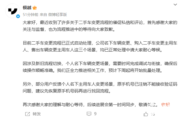 8月4日,极越汽车官方今日就网友关心的二手车变更流程问题发文并表示,已正式启动处理,个人名下车辆变更场景正全力推进相关工作,预计下周起将开始批量处理。