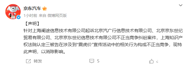 8月4日,京东汽车今日在社交媒体发文表示,上海知识产权法院认定三被告在涉及到“震虎价”宣传活动中的相关行为构成不正当竞争,现特此声明,以消除影响。