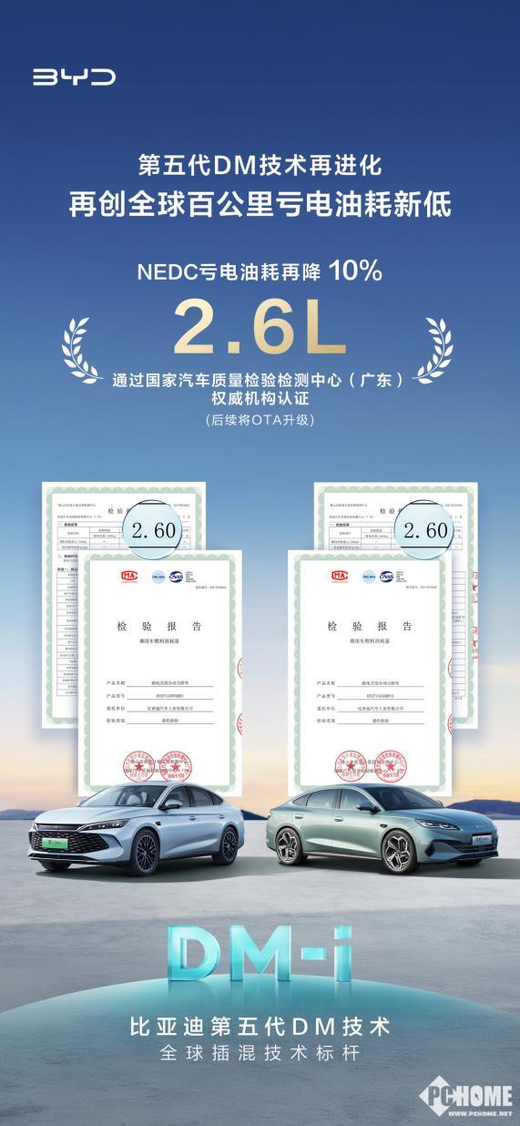 2024年5月28日,比亚迪发布第五代DM技术,实现了NEDC百公里亏电油耗2.9L,开创油耗2时代,发布一年之久,至今还没被超越。今天,比亚迪正式宣布第五代DM技术再进化,NEDC工况的百公里亏电油耗再降10%,刷新至2.6L,并通过了国家汽车质量检验检测中心(广东)权威机构认证,再创全球百公里亏电油耗新低。比亚迪第五代DM技术是当之无愧的全球插混技术标杆!