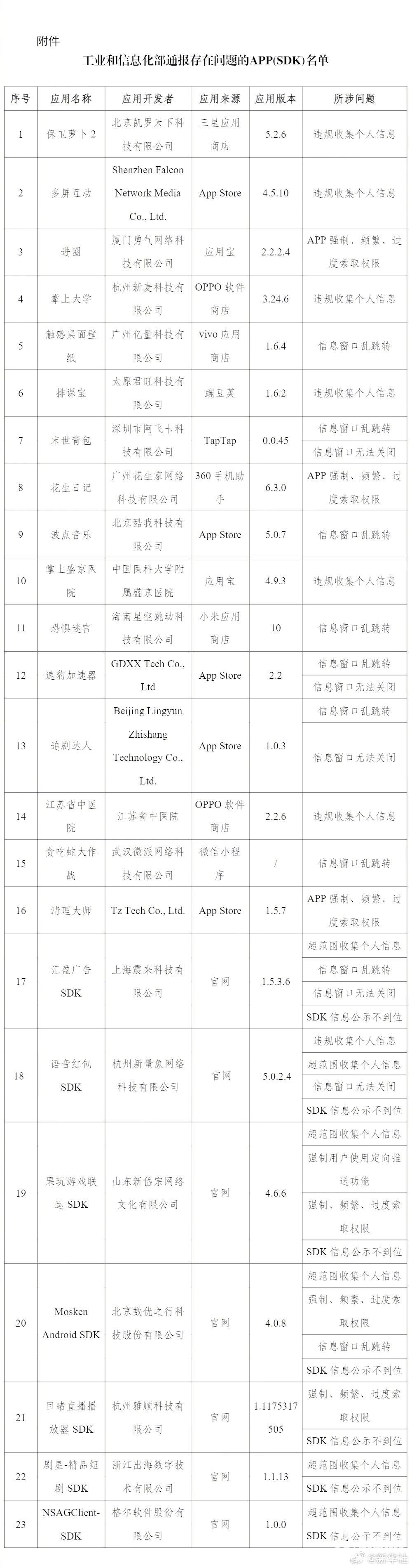 工信部对外表示,上述APP及SDK应按有关规定进行整改,整改落实不到位的,工业和信息化部将依法依规组织开展相关处置工作。