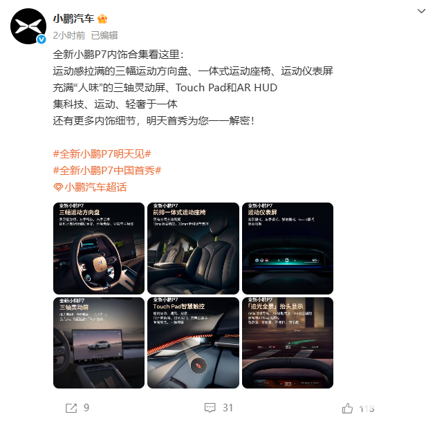 8月5日,小鹏汽车今日公布了全新小鹏P7的更多内饰细节,该车将于明日(8月6日)正式首秀亮相。