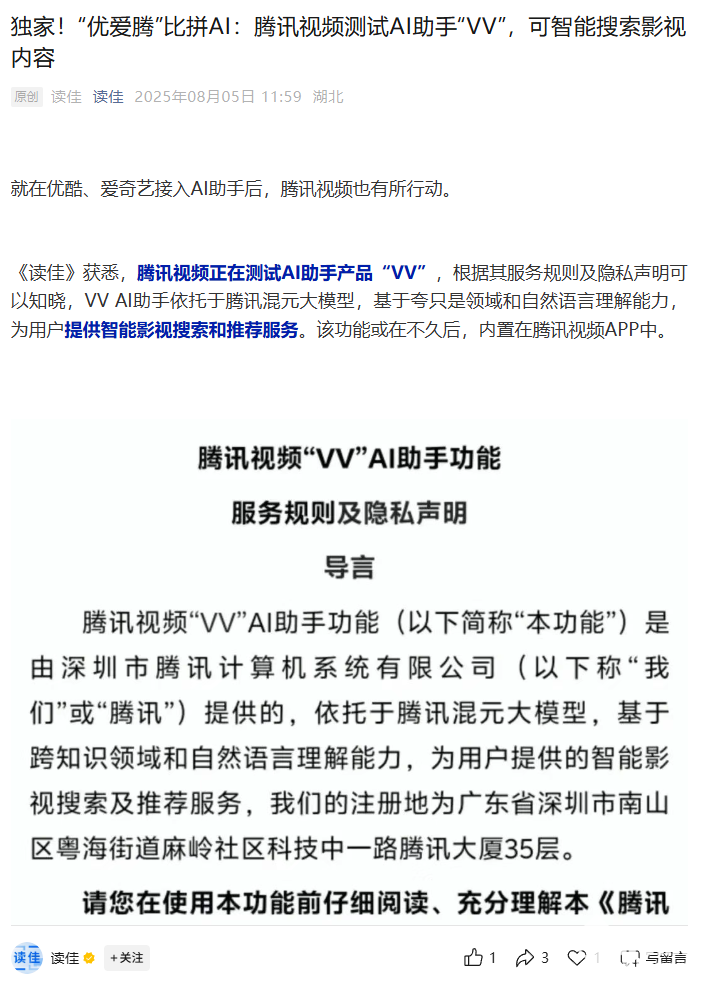 8月5日,据“读佳”公众号今日报道,就在优酷、爱奇艺接入AI助手后,腾讯视频正在测试AI助手产品“VV”,该功能或在不久后,内置在腾讯视频APP中。